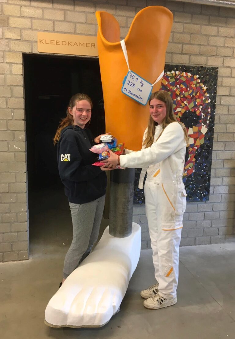 De collega’s en leerlingen van onze unieke richting Orthopedische technieken maakten voor de open dag van zondag 24 april een gigantische onderbeenprothese. Bezoekers mochten gokken