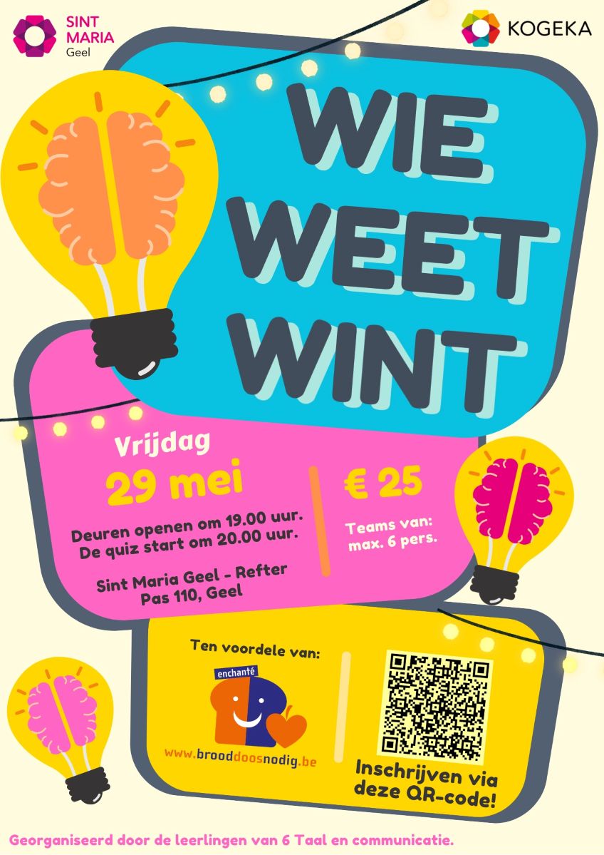 Vrijdag 29 mei organiseren de leerlingen van 6 Taal en communicatie van Sint Maria Geel de quiz “Wie weet wint!”. De opbrengst gaat integraal naar het Brooddoosnodig project van onze school.